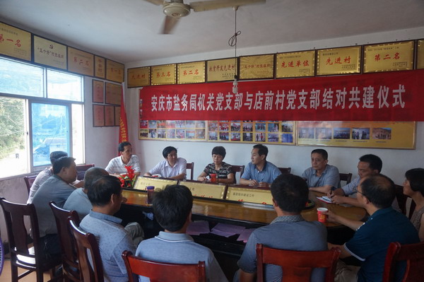 7月15日,安庆市盐务管理局副局长、机关党支部书记许章宜率配送中心党支部、仓储党支部、工会等部门一行五人,前往岳西县店前镇店前村,进行支部结对共建和走访慰问贫困户活动。店前镇党委书记王传新等参加了支部结对共建仪式。