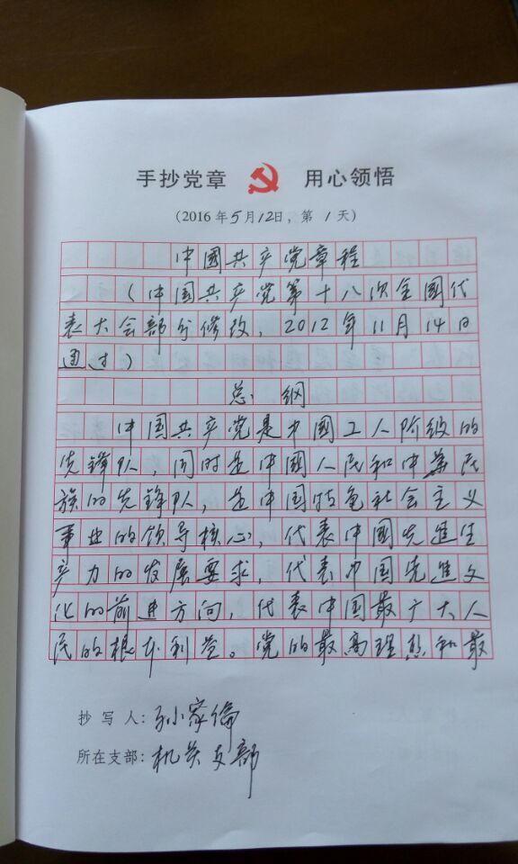 公司党委统一印制了专门的抄写本,要求每个在职党员按每天抄写150字的速度用100天抄写完毕。做到每天坚持,在手抄党章的过程中,逐句逐字研读党章,自觉尊崇党章,遵守党章,维护党章,进一步增强党性观念,做合格党员。