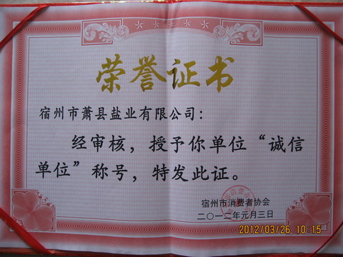 萧县公司荣获宿州市消协首届“诚信单位”称号