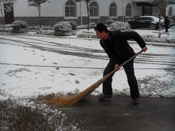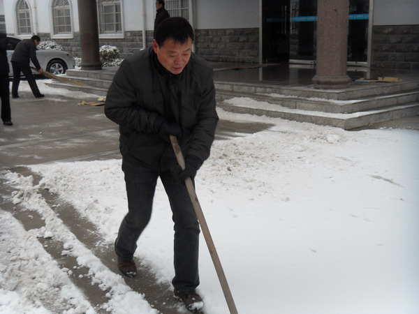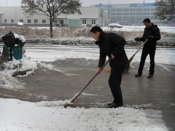 2月10日,一场大雪如期而至,一夜间,皖北大地银装素裹,白雪皑皑。厚厚的积雪也给人们的出行和道路交通带来了不便。在宿州公司,早晨点名刚一结束,公司行管人员你一把铁锹,我一把扫帚,冒着寒风清除积雪,干的热火朝天,公司经理张鹰身先士卒,甩开膀子与大家一道铲积雪、扫路面。至9点,将办公场所的积雪清除干净,方便了人员和配送车辆的通行。