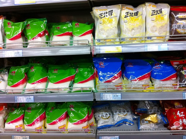 超市货架上摆放的“中糖”牌小包装食糖